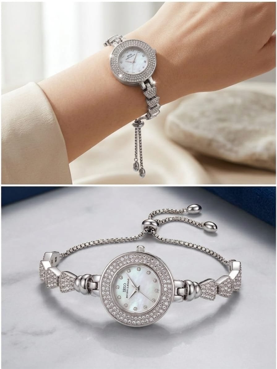 • قطعة فنية تجمع بين دقة الساعة وجمالية الإسوارة المرصعة، مثالية للمناسبات ولإضافة لمسة من البريق لإطلالتك اليومية بفضل جودة صناعتها وتصميمها الجذاب.