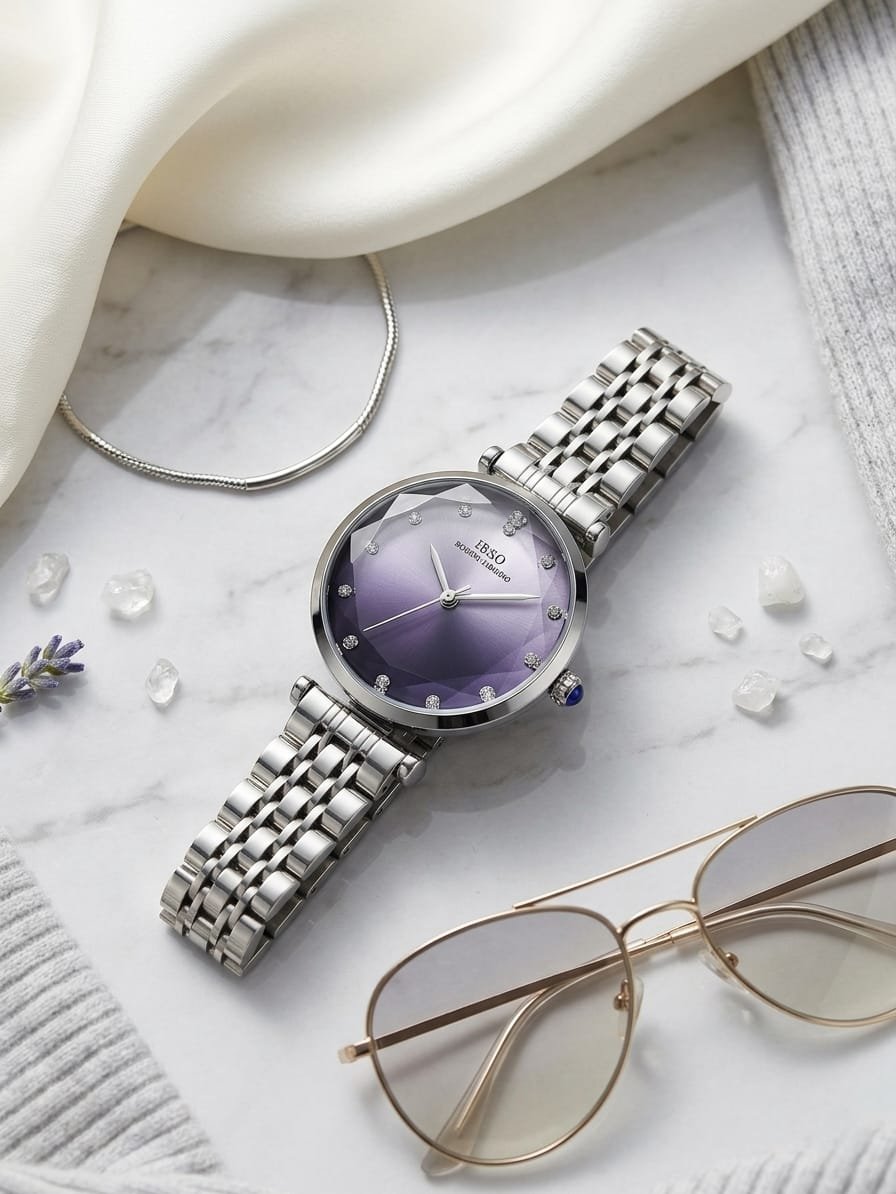 كمية ساعة يد نسائية ماركة IBSO فضية مع لون مموج بين الازرق والبنفسجي